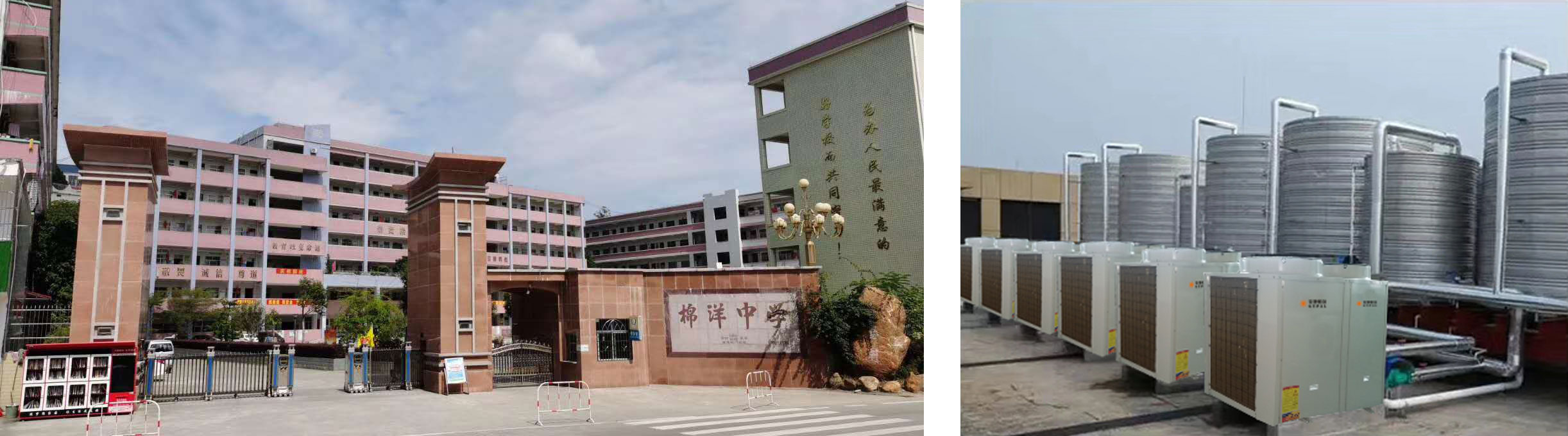 梅州市五華縣棉洋中學——7臺10匹金地帕爾空氣能熱泵機組,日產量70噸熱水,每天可提供1800名師生熱水供應