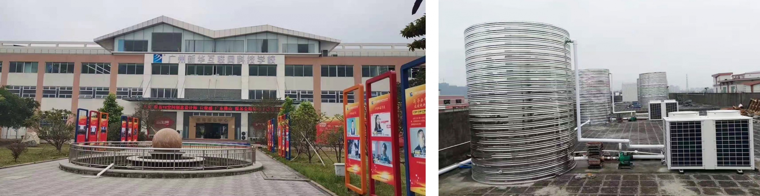 在線咨詢廣州新華互聯(lián)網(wǎng)科技學(xué)校——4臺10匹金地帕爾空氣能熱泵機(jī)組,日產(chǎn)量40噸熱水,每天可提供1000名師生熱水供應(yīng)